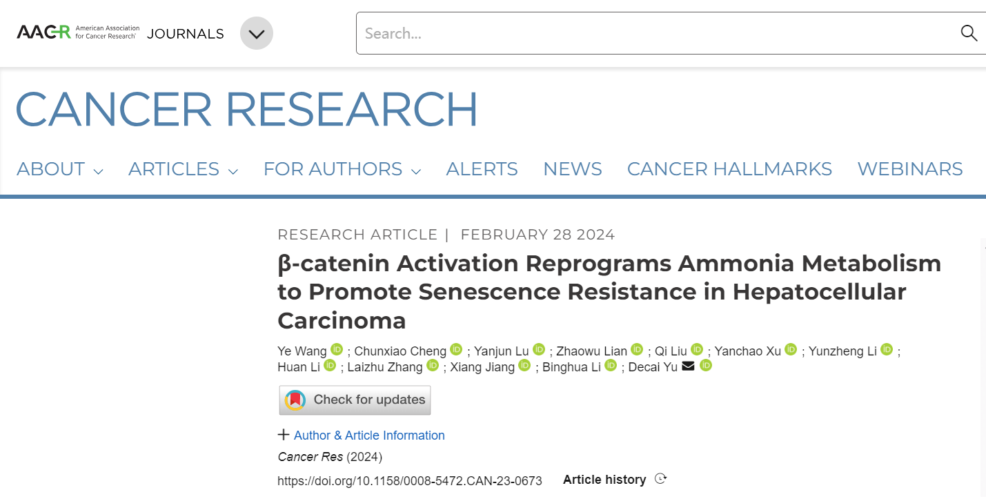 近日,黄色网 附属鼓楼医院肝胆与肝移植外科余德才教授团队题为“β-Catenin Activation Reprograms Ammonia Metabolism to Promote Senescence Resistance in Hepatocellular Carcinoma”的研究论文发表在国际期刊Cancer Research上。黄色网 毕业生王烨博士为该论文第一作者,黄色网 附属鼓楼医院余德才教授、黎兵华主治医师为该论文共同通讯作者。
