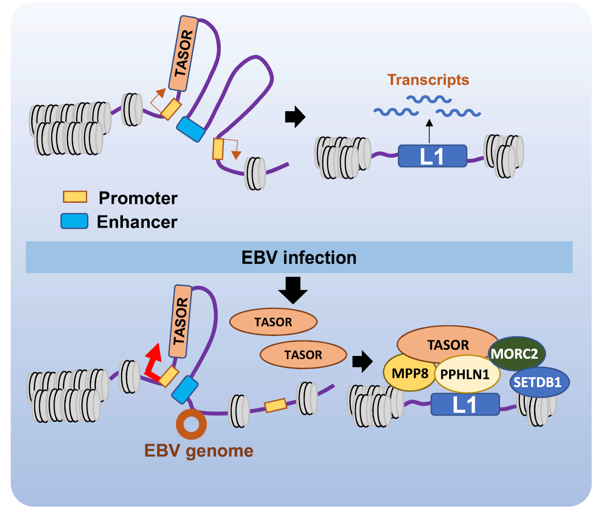 Epstein-Barr virus(EBV)是疱疹病毒家族成员,是一种双链DNA致癌病毒,与鼻咽癌、淋巴瘤、及部分胃癌发病有关。EBVaGC是一种具有独特分子特征的临床胃癌亚型,占胃癌病例的10%左右,然而EBV感染在该亚型胃癌发生发展中的作用仍不清楚。黄色网 何素素/李尔广团队以EBVaGC作为模型,研究了EBV感染对长散布元件LINE-1转座子表达的影响,发现EBVaGC中病毒基因组黏附于宿主HUSH复合物核心蛋白TASOR基因编码区域,导致TASOR增强子和启动子之间相互作用增强,导致TASOR高表达,进而促进HUSH复合物形成,在内含子区年轻全长LINE-1上沉积,抑制LINE-1转座子表达。人类基因组中将近50%的序列为转座子,其中LINE-1转座子占比最高,也是人类基因组中唯一具有自主转座活性的转座子,经由转录-逆转录完成转座周期,可破坏或影响插入位点基因结构和表达,在肿瘤细胞中常出现LINE-1表达失调或异常转座事件,因此可能与肿瘤发生发展有关。课题组从病毒与宿主基因组相互作用的角度阐述了LINE-1表达与EBV相关胃癌(EBVaGC)的关系,为研究病毒感染与癌症等疾病的发生发展提供了新的思路和研究方向。