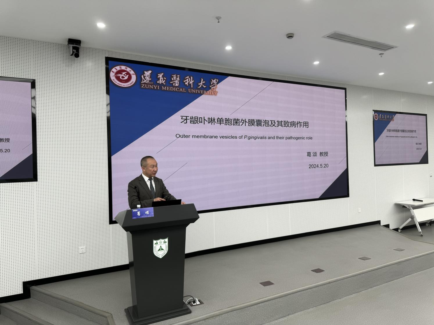 遵义医科大学口腔黄色网 院长葛颂教授的讲授围绕“牙龈卟啉单胞菌外膜囊泡及其致病作用”展开。葛教授深入浅出地解释了复杂的医学研究课题,毫无保留地将自己最新的研究成果和研究启示与师生们进行分享。