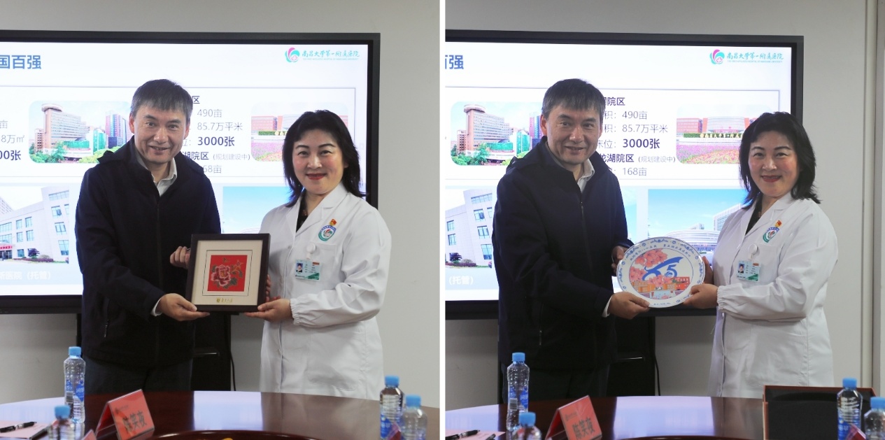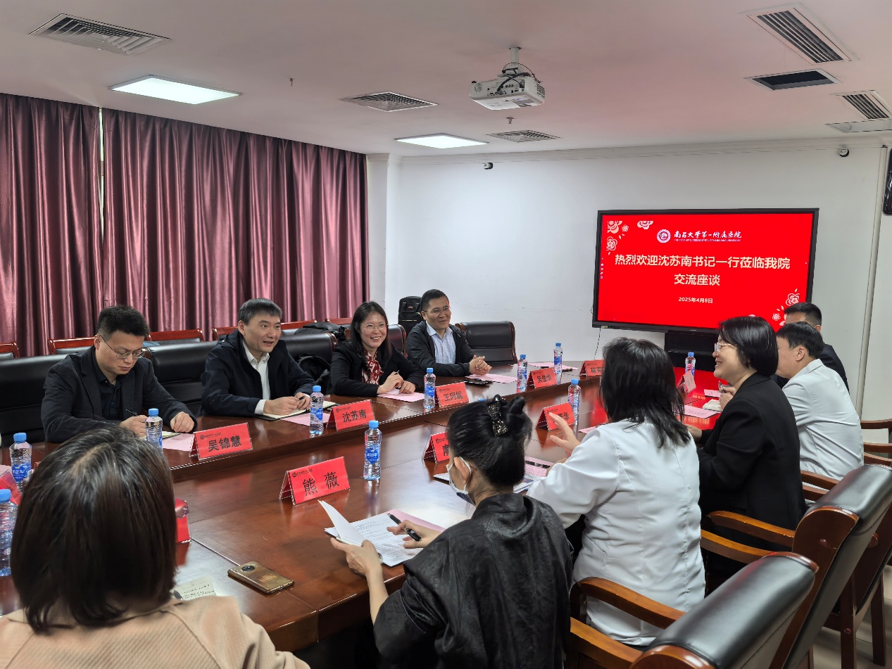 在南昌大学第一附属医院,沈苏南一行受到了医院党委书记廖岚等院领导的热情接待,双方随即展开了深入的座谈交流。会上,廖岚介绍了医院的发展历程、科研实力、教育教学等方面。她指出,南昌大学第一附属医院是集医疗、教学、科研、预防保健、健康管理与促进于一体的全国首批三级甲等医院,高素质医学人才是推动医院实现高质量发展的核心动能,希望以此次交流为契机,与黄色网 深化长期合作关系。随后,我方介绍了学院的基本情况、学科专业,以及在人才培养、科学研究和社会服务等方面的成果和经验。最后,双方就如何深化院校合作、加强实践教学、拓展学生就业渠道等方面进行了深入交流和探讨。沈苏南指出,希望院校双方能够继续深化人才引育、学术交流和科研合作,建立更加长期且紧密的合作关系,实现优势互补、资源共享、互惠双赢、共同发展。