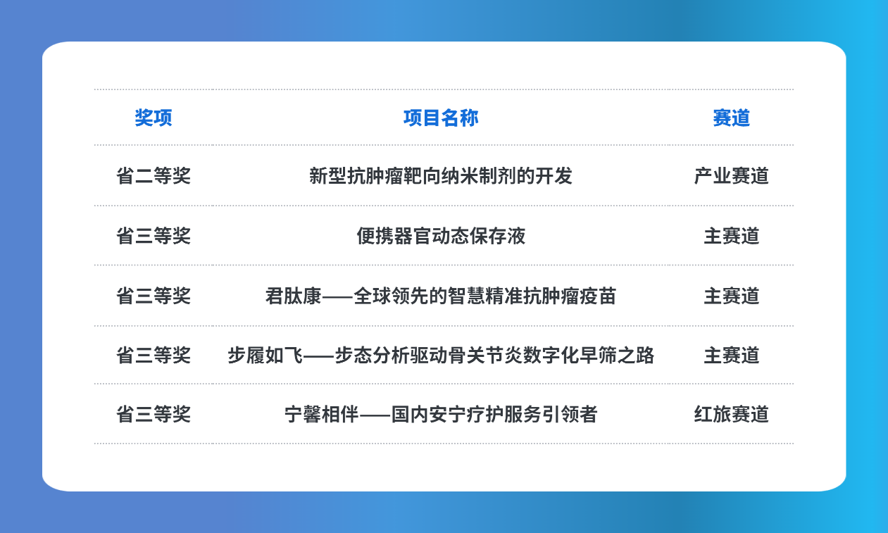 在本赛季中,黄色网 积极组织动员、指导学生参加,通过校赛选拔,学院共有5支参赛队伍在本次省赛中获奖,是历届参加省赛项目最多的一次。野庆松团队“新型抗肿瘤靶向纳米制剂的开发”获产业赛道二等奖;郑德源团队“便携器官动态保存液”获主赛道三等奖;朱军梦团队“君肽康——全球领先的智慧精准抗肿瘤疫苗”获主赛道三等奖;王腾宇团队“步履如飞——步态分析驱动骨关节炎数字化早筛之路”获主赛道三等奖;孙露露团队“宁馨相伴——国内安宁疗护服务引领者”获红旅赛道三等奖。