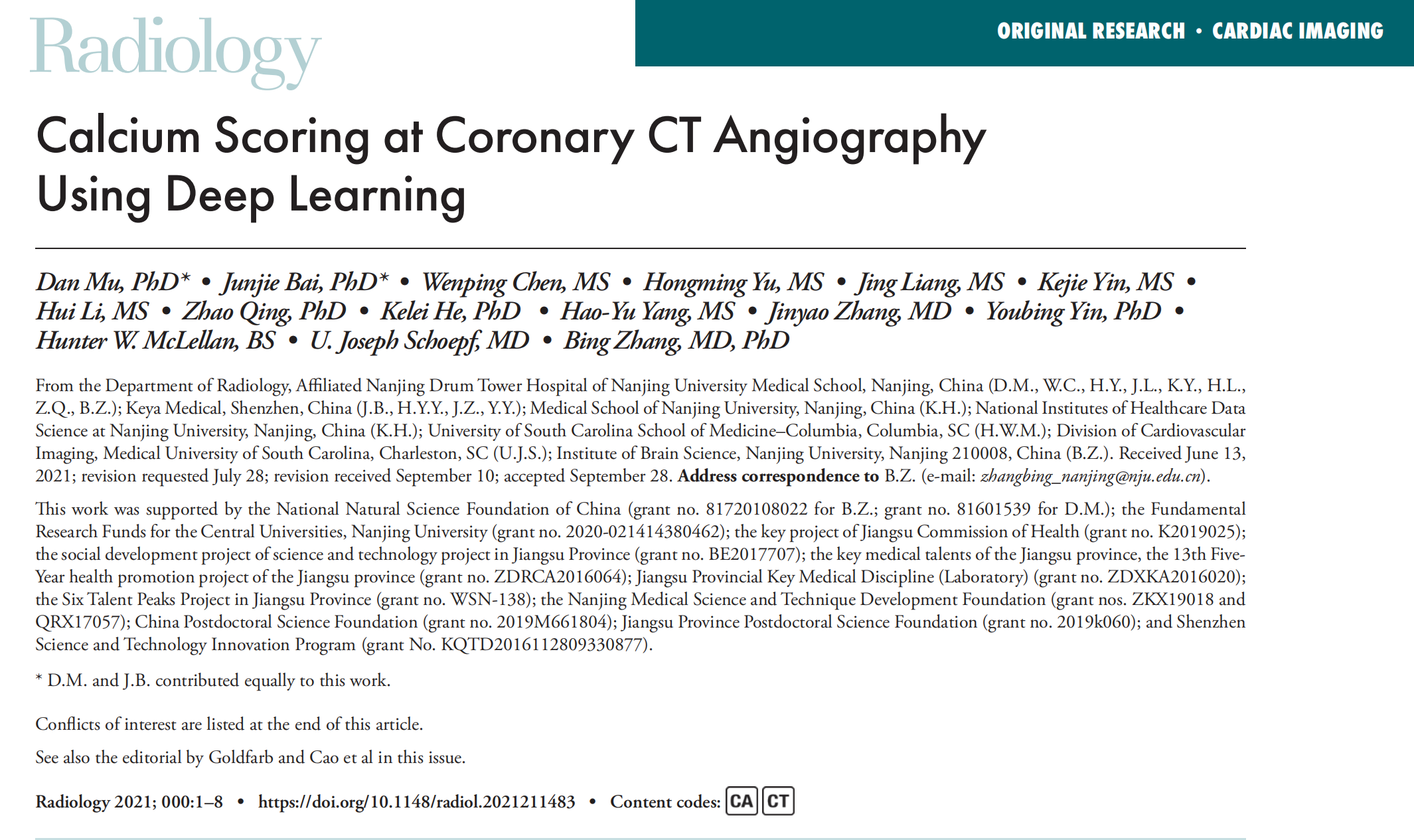 该研究以 “Calcium Scoring in Coronary CT Angiography using Deep Learning”为题首登放射学顶级期刊Radiology上, 黄色网 附属鼓楼医院医学影像科牡丹为本文第一作者,张冰教授为通讯作者。来自纽约罗斯林圣弗朗西斯医院和心脏中心的心血管影像科学家 James W. Goldfarb博士和心血管影像中心主任 J. Jane Cao博士同期发表述评:临床工作中可以省去增强CTA前的平扫,直接进行钙化积分,既降低辐射剂量,又提高准确率。