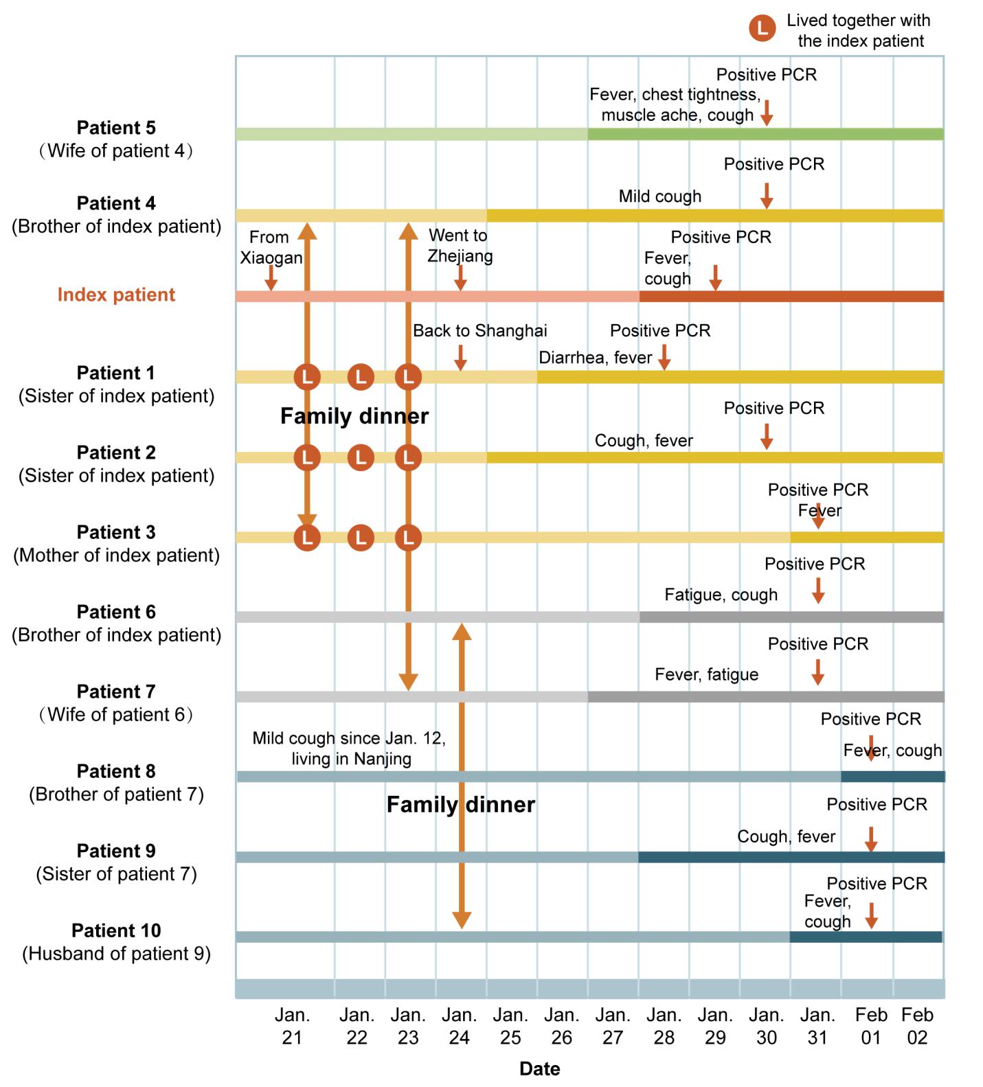 图2. 一起涉及11名患者的新冠病毒感染家族聚集病例