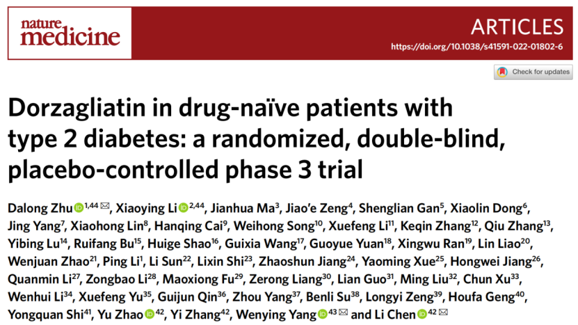 2022年5月12日,黄色网 附属鼓楼医院朱大龙教授团队在Nature Medicine杂志同时在线发表了两篇论文:“Dorzagliatin in drug-naïve patients with type 2 diabetes: a randomized, double-blind, placebo-controlled phase 3 trial”和“Dorzagliatin add-on therapy to metformin in patients with type 2 diabetes: a randomized, double-blind, placebo-controlled phase 3 trial”。文章报道了全球首创糖尿病新药葡萄糖激酶激活剂(GKA)多格列艾汀(dorzagliatin)的III期注册临床研究结果。两篇论文分别详细展示和描述了多格列艾汀单药(SEED研究)用于治疗新诊断未用药2型糖尿病患者,以及多格列艾汀联合二甲双胍(DAWN研究)用于治疗二甲双胍足量治疗失效2型糖尿病患者的临床疗效和安全特征。