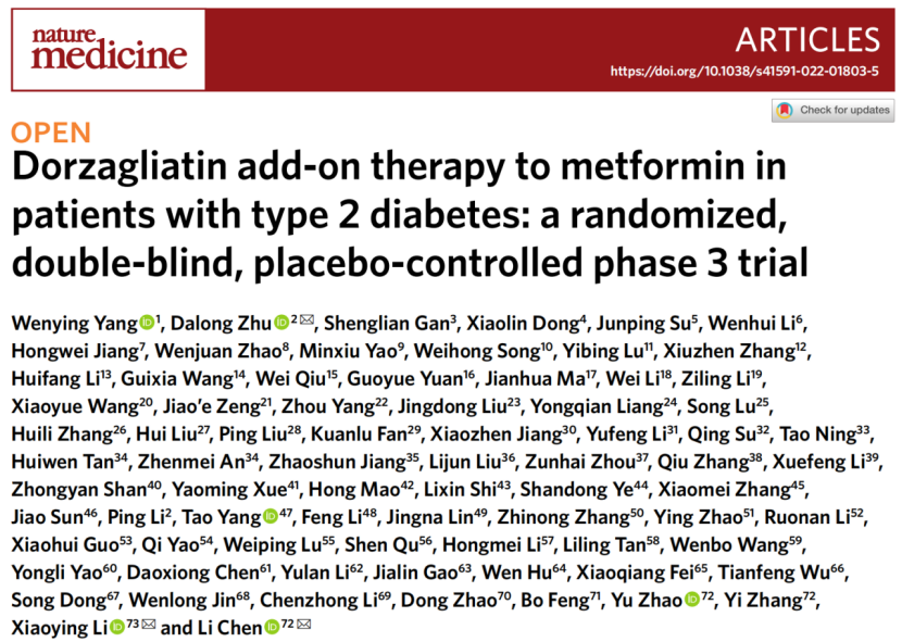 此次发表的两篇文章分别呈现了多格列艾汀SEED研究和DAWN研究两项III期临床研究的结果。在第一篇文章中,SEED研究(播种研究)为多格列艾汀单药研究,是在新诊断未用药的T2D患者中进行的随机、双盲、安慰剂对照的III期注册临床研究,在463名T2D患者中开展。前24周为随机、双盲、安慰剂对照治疗期,用以评估试验的主要疗效和安全性终点,后28周为多格列艾汀开放治疗期,用以持续观察和评估多格列艾汀的安全性。研究结果表明,多格列艾汀可以有效降低新诊断未用药T2D患者的血糖,同时具有良好的安全性和耐受性。黄色网 附属鼓楼医院朱大龙教授,北京中日友好医院杨文英教授,华领医药陈力博士为第一篇文章的通讯作者;