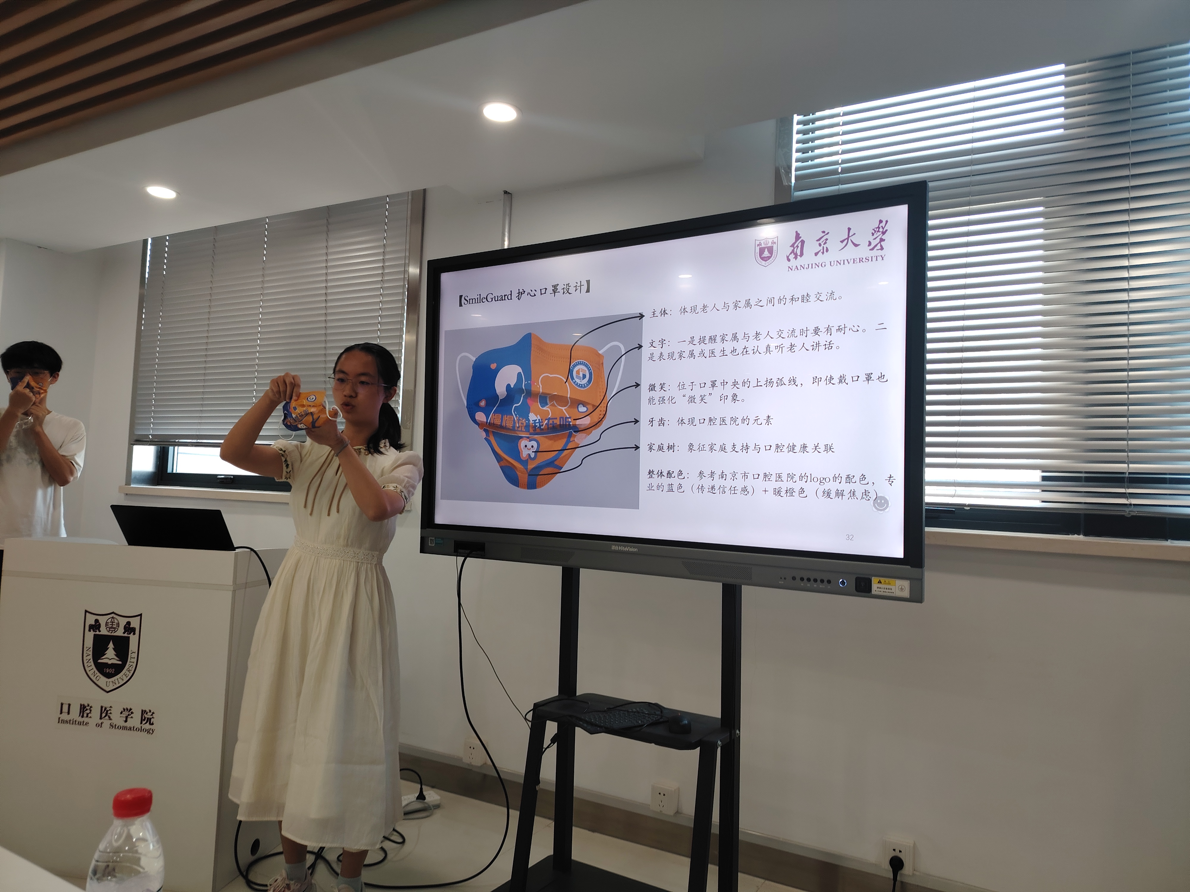 同学们通过与老年患者面对面访谈、收集调查问卷,制作科普视频,设计“Smlie guard”护心口罩周边,以帮助降低家庭生态因素对老年口腔患者就诊的不利影响。(指导老师:老年口腔诊疗中心 康文)