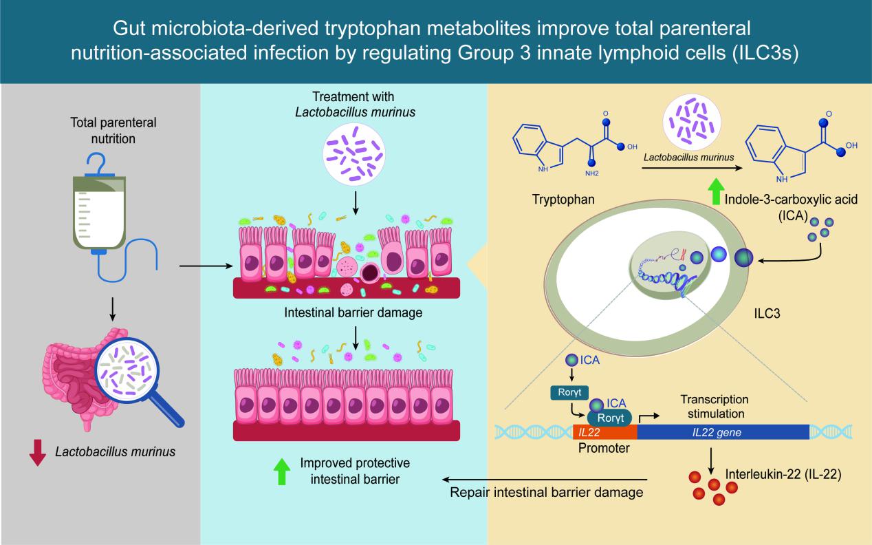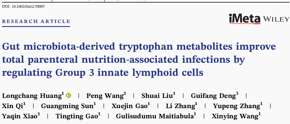2025年2月26日,黄色网 附属金陵医院王新颖课题组在iMeta在线发表了题为“Gut microbiota-derived tryptophan metabolites improve total parenteral nutrition-associated infections by regulating Group 3 innate lymphoid cells”的研究成果。这项研究阐明了TPN过程中的“微生物-代谢-免疫”的调控机制,证明了靶向肠道微生物及肠道免疫稳态治疗IF、实现真正的“人工胃肠”是有希望的,为扭转“肠衰竭”不良结局和促进IF病人的肠康复治疗提供了重要的理论基础。黄色网 博士生黄龙昌、王鹏、刘帅和华中科技大学协和深圳医院邓桂芳为本文的共同第一作者。黄色网 附属金陵医院王新颖教授为本文的通讯作者。该项研究得到了国家自然科学基金委、科技部、江苏省科技厅以及中央高校等基金的支持,并在相关研究方面得到合作实验室的大力协助与支持。