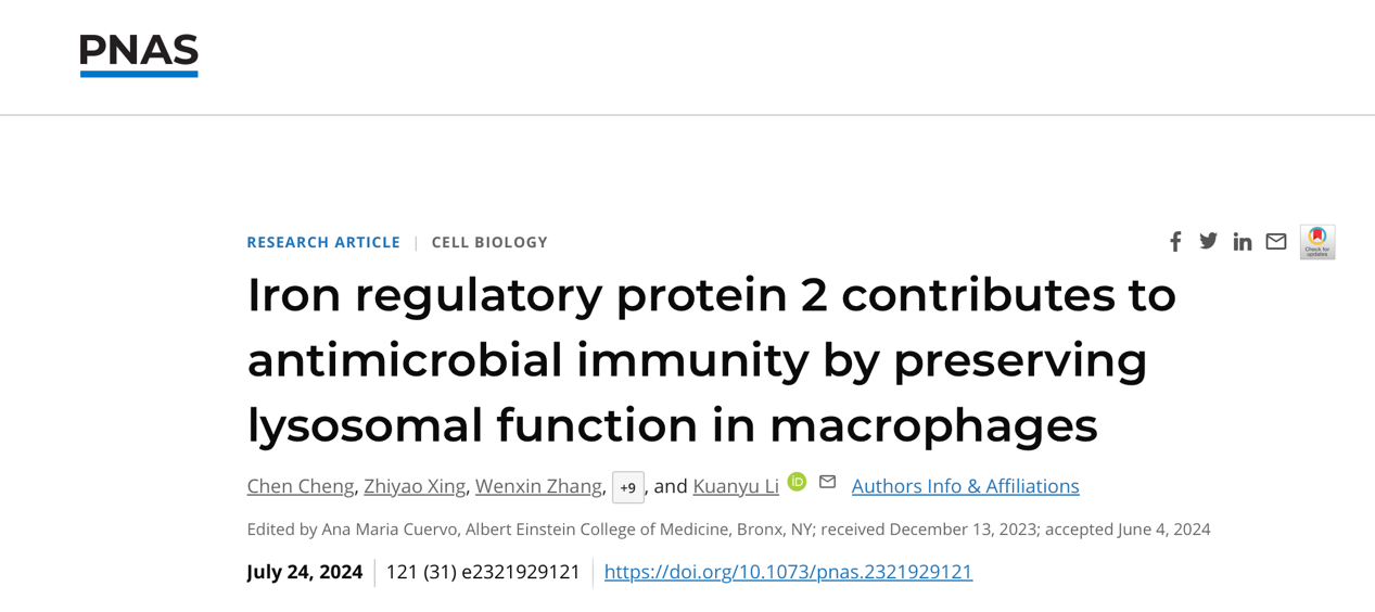 2024年7月24日,李宽钰课题组在PNAS杂志发表了题为“Iron regulatory protein 2 contributes to antimicrobial immunity by preserving lysosomal function in macrophages”的研究论文。该研究开拓了IRP2的功能,阐明了IRP2对免疫细胞功能的影响,为临床治疗肠源性肝脓肿提供新的靶点。黄色网 李宽钰教授和黄色网 附属鼓楼医院樊智文副研究员为论文通讯作者,黄色网 博士生程晨为本文的第一作者。本研究得到了以色列理工大学Esther Meyron-Holtz教授,墨西哥Cinvestav的Fanis Missirlis教授的帮助;得到了黄色网 附属金陵医院普外科的李毅教授、附属鼓楼医院血管外科的乔彤教授和河北师范大学常彦忠教授等的大力帮助;得到了国家自然科学基金(#32271221, #82170592)的资助。