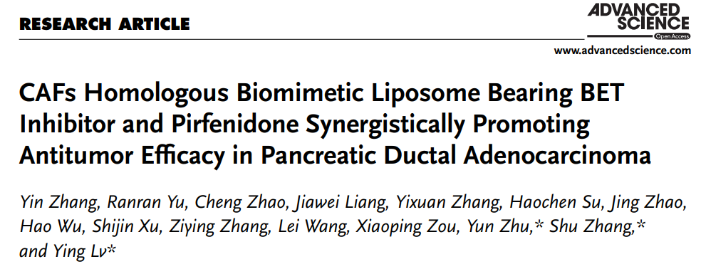 2023年11月16日,黄色网 附属鼓楼医院吕瑛教授、张舒博士和朱运药师在Advanced Science在线发表题为CAFs Homologous Biomimetic Liposome Bearing BET Inhibitor and Pirfenidone Synergistically Promoting Antitumor Efficacy in Pancreatic Ductal Adenocarcinoma的研究论文,该研究对胰腺癌肿瘤微环境中CAFs的功能表型进行了全面的描述,设计新型靶向材料针对CAFs,为胰腺癌的治疗提供新的理论基础和治疗见解。黄色网 附属鼓楼医院吕瑛教授、张舒博士,朱运博士为本文的共同通讯作者。黄色网 硕士研究生张尹、黄色网 生命科学学院博士研究生于冉冉、黄色网 附属鼓楼医院赵成博士为本文的共同第一作者。
