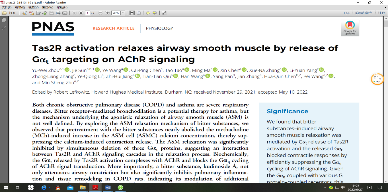 上述研究成果“Tas2R Activation Relaxes Airway Smooth Muscle by Release of Gαt Targeting on AChR Signaling”已于2022年6月23日发表在美国科学院院报《PNAS》杂志上。论文的通讯作者为黄色网 朱敏生教授、王佩博士和南京师范大学陈华群教授,第一作者为黄色网 周雨薇博士、孙婕博士,上海凯屹医药公司、云南大学的科研人员也参与了该项研究。