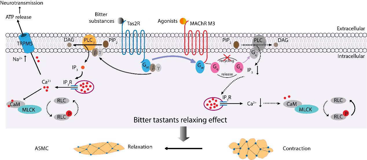 自然界中存在大量苦味物质,人类口腔中表达了二十多种不同的苦受体(Tas2R)用来感知这类物质。有意思的是,呼吸道也能表达苦受体,当苦物质作用于该受体时可导致气道舒张,有可能用于哮喘及慢性阻塞性肺病(COPD)的治疗,但苦受体松弛气道平滑肌的机制及其下游信号一直不清楚。黄色网 朱敏生教授课题组联合南京师范大学、上海凯屹医药科技公司等单位,通过多年探索终于揭示了苦物质松弛气道的机制。研究发现:苦物质激活Tas2R后,其偶联G蛋白Gαt 从Tas2R-Gαt/Gβγ 复合体中解离,释放出的Gαt与乙酰胆碱受体(AChR)结合,竞争性抑制AChR的偶联G蛋白Gq 的功能,阻止AChR信号诱导的钙信号,并引起平滑肌松弛。该发现不但首次完善地阐明了苦受体松弛气道平滑肌的机制,还引伸出更有意义的发现,即:因Gq与多种GPCR偶联,Gαt 对 Gq 的阻断可同时作用于多条信号通路,表现为多靶点效应。